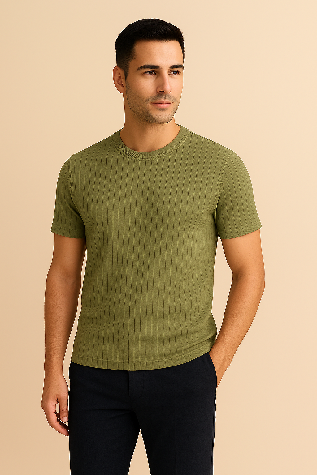 This drop-needle knit shirt features a refined vertical-rib texture that adds depth and sophistication to a simple silhouette. Made from soft, breathable fabric, it offers a comfortable stretch and a smooth, tailored fit that flatters the body. The classic crew neckline and minimalist design make it easy to style—perfect for everyday wear, casual meet-ups, or pairing with smart trousers for a polished look.