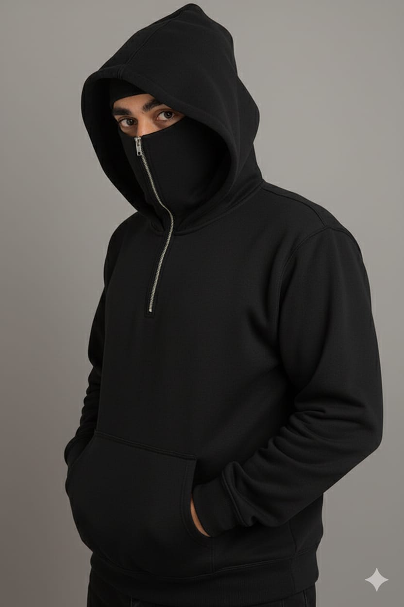 Stay warm, covered, and effortlessly stylish with this Balaclava Pullover Hoodie. Designed with a built-in zippered face cover, it offers versatile protection against cold weather while maintaining a sleek, modern look. The soft, insulating fabric keeps you comfortable, and the adjustable hood ensures a secure fit. Finished with a roomy kangaroo pocket and ribbed cuffs, this hoodie blends function and streetwear style in one standout piece.