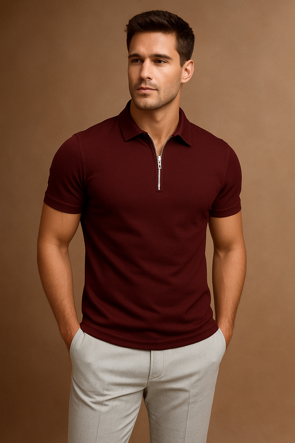 A refined half-zip polo crafted from soft, stretchable fabric for a sleek and comfortable fit. The rich maroon color adds a bold, modern touch, while the metal zip detail elevates the overall style. Perfect for smart-casual looks, pairing effortlessly with trousers, chinos, or jeans.