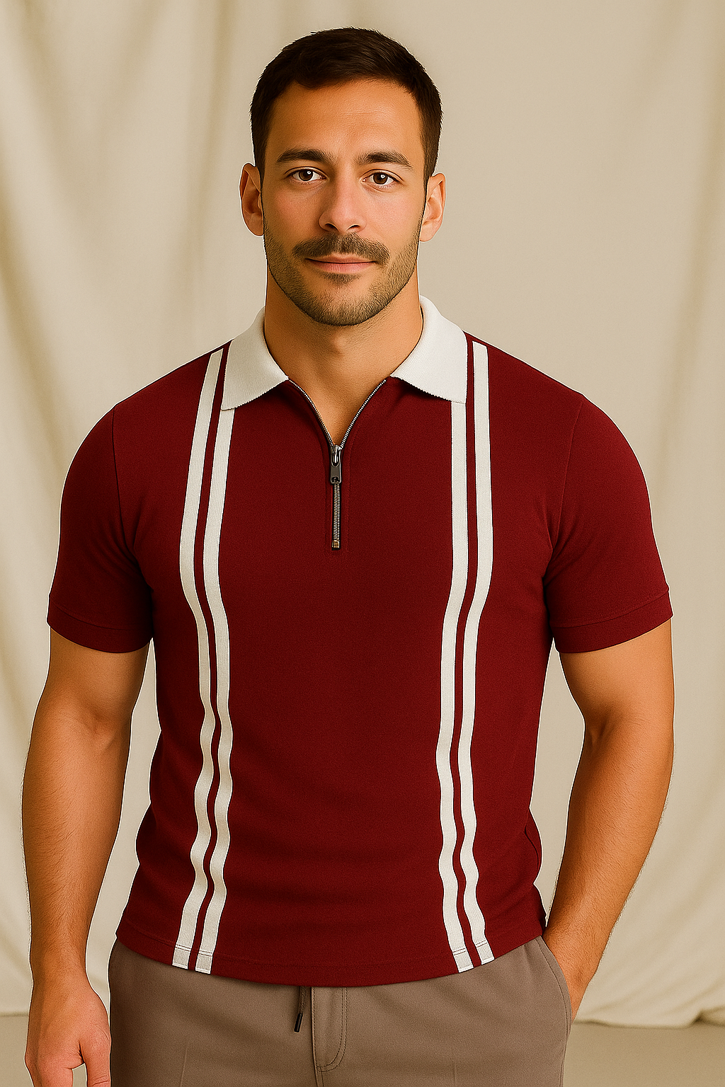Elevate your everyday style with this Zipper Striped Polo, designed with a rich maroon base and bold vertical contrast stripes for a sleek, modern look. The soft, breathable fabric ensures all-day comfort, while the half-zip neckline adds a contemporary twist to the classic polo design. Finished with a crisp contrast collar, this shirt is perfect for casual outings, evening plans, or smart-casual wear.
